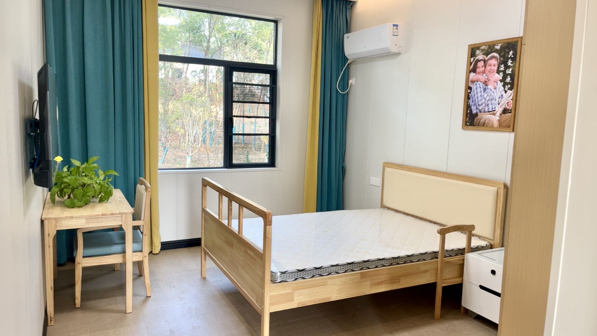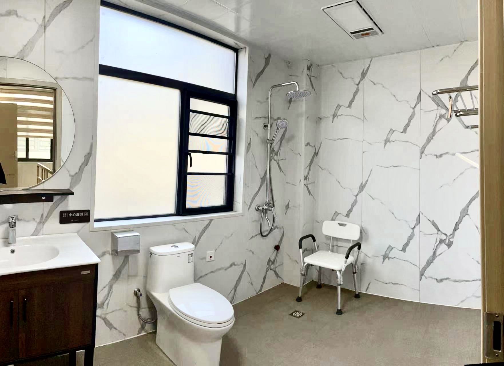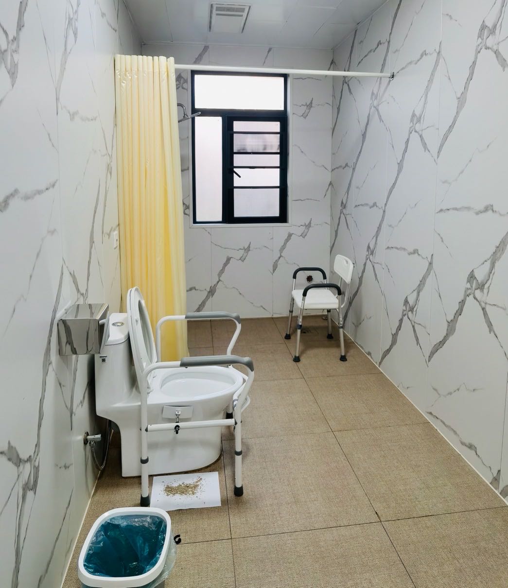 衛(wèi)生間的馬桶配有防護(hù)設(shè)施,能保證長(zhǎng)者的安全,房間其他配套設(shè)施齊全,就像自己的家一樣溫馨。
